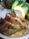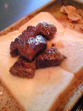 焼き上がったお肉は、食パンの上に。ガーリックチップをお好みで。ミディアムレアに焼いていただきました。