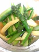 アスパラのおいしい季節がやってきました アスパラだけのお浸しにしようかっともおもったのですが、 ヤングコーンも一緒に浸しちゃえってことで、 アスパラとヤングコーンのお浸し